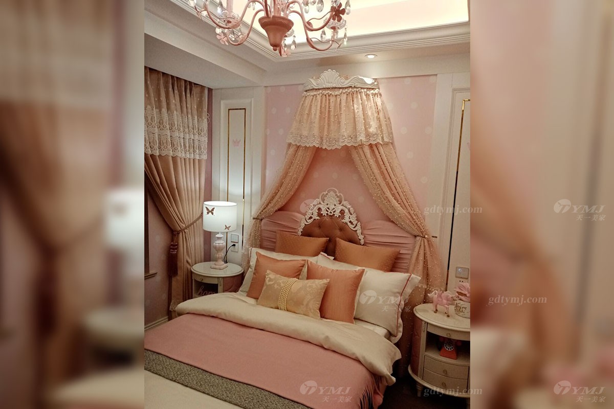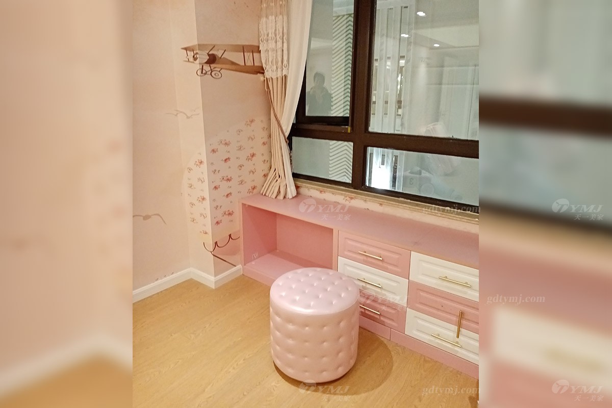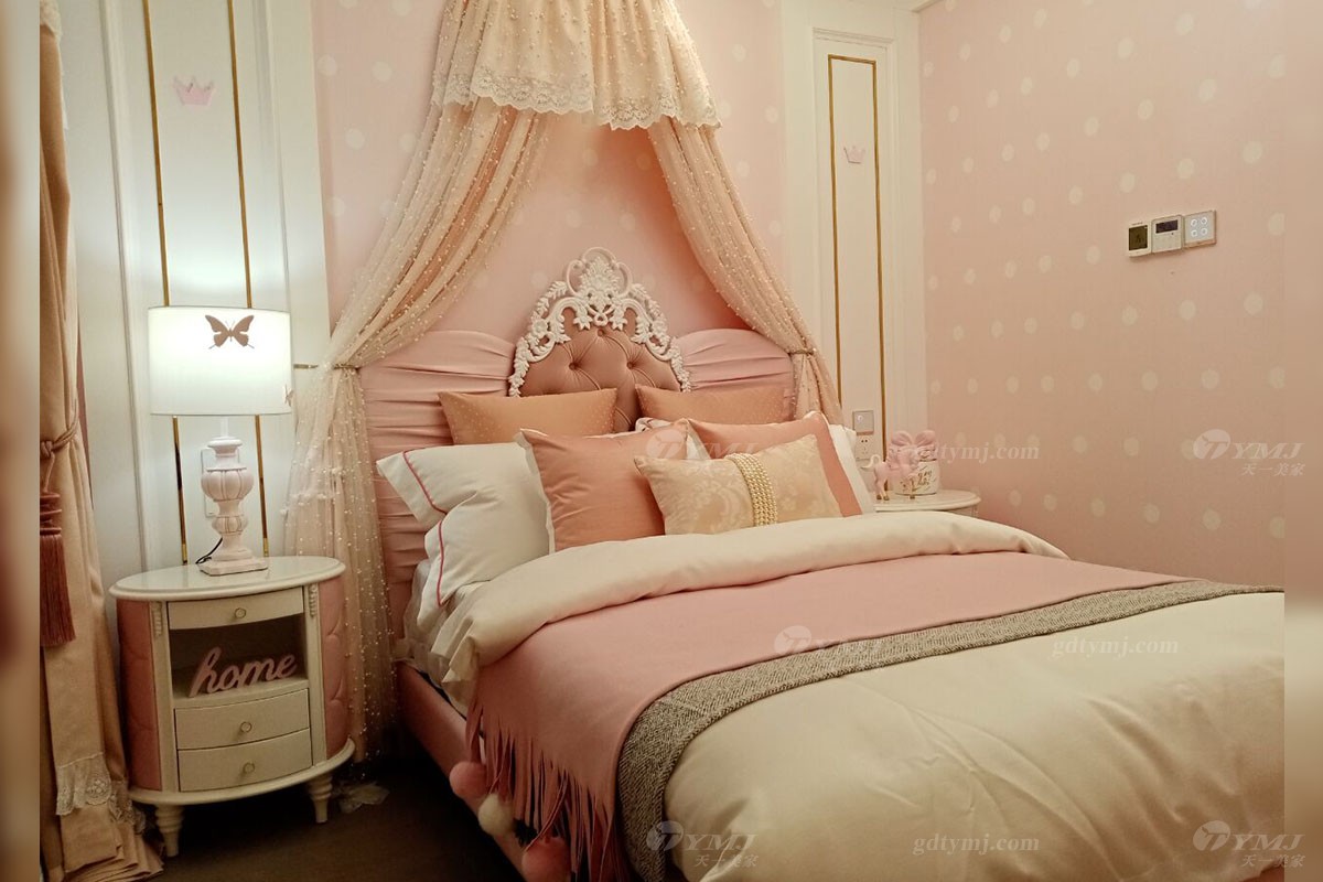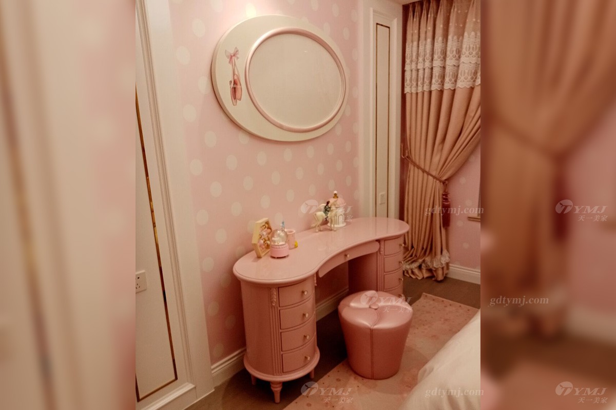 女兒房以粉色、白色為基調(diào)的墻飾面,加了一些童趣的圖案和五金裝飾,再搭配浪漫優(yōu)雅的粉色家具、軟裝布藝,使得整個(gè)空間色調(diào)上非常柔和、溫馨的感覺。